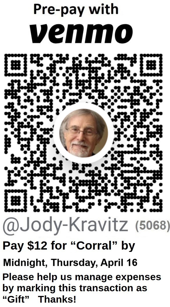 Get a 20% discount if you pay by Midnight Thursday night, April 16 -- pay me in person or use the Venmo QR code below.